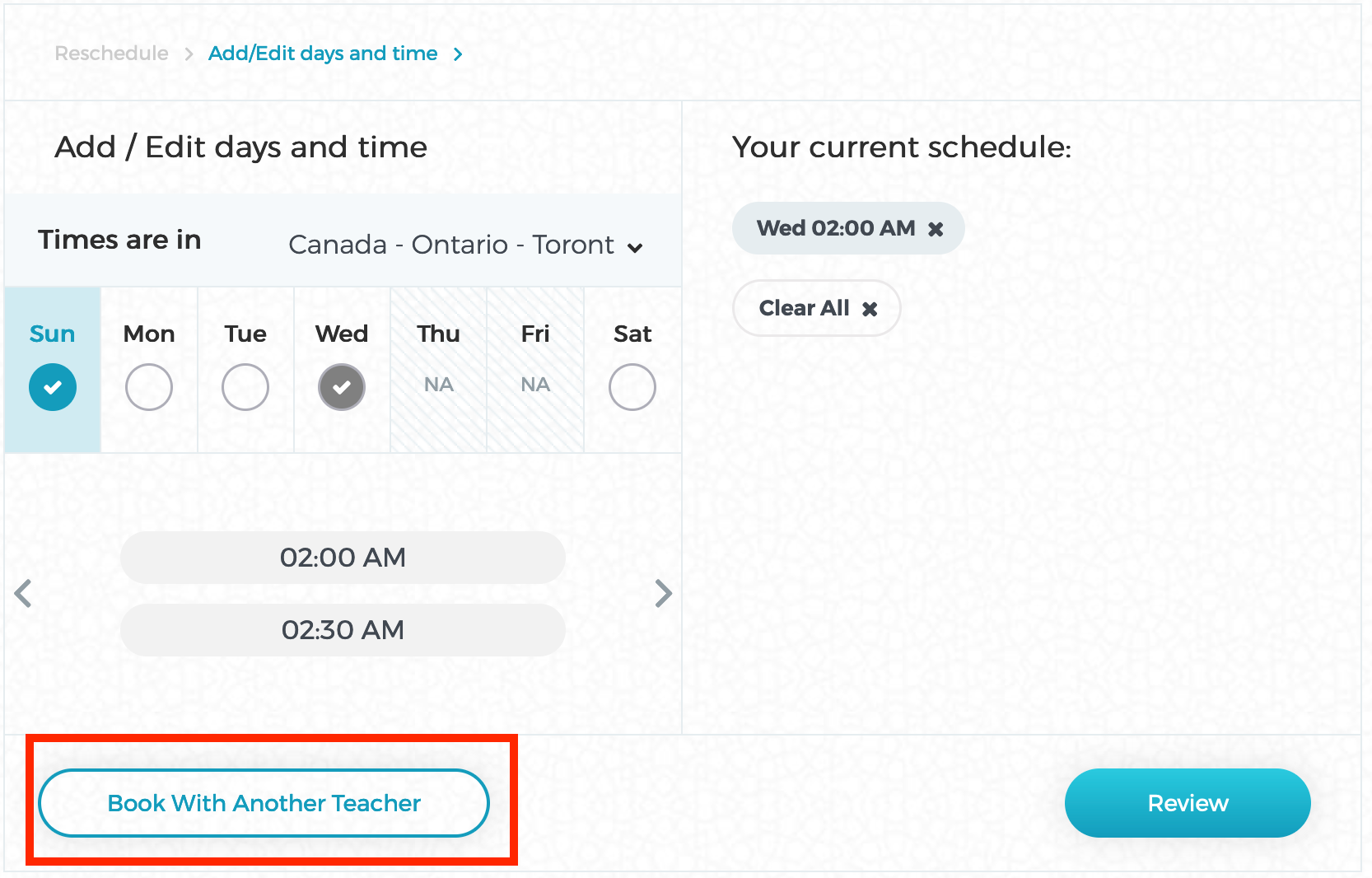 Step 3: On the time selection screen, look to the bottom left and you will see a button: "Book with another teacher".
